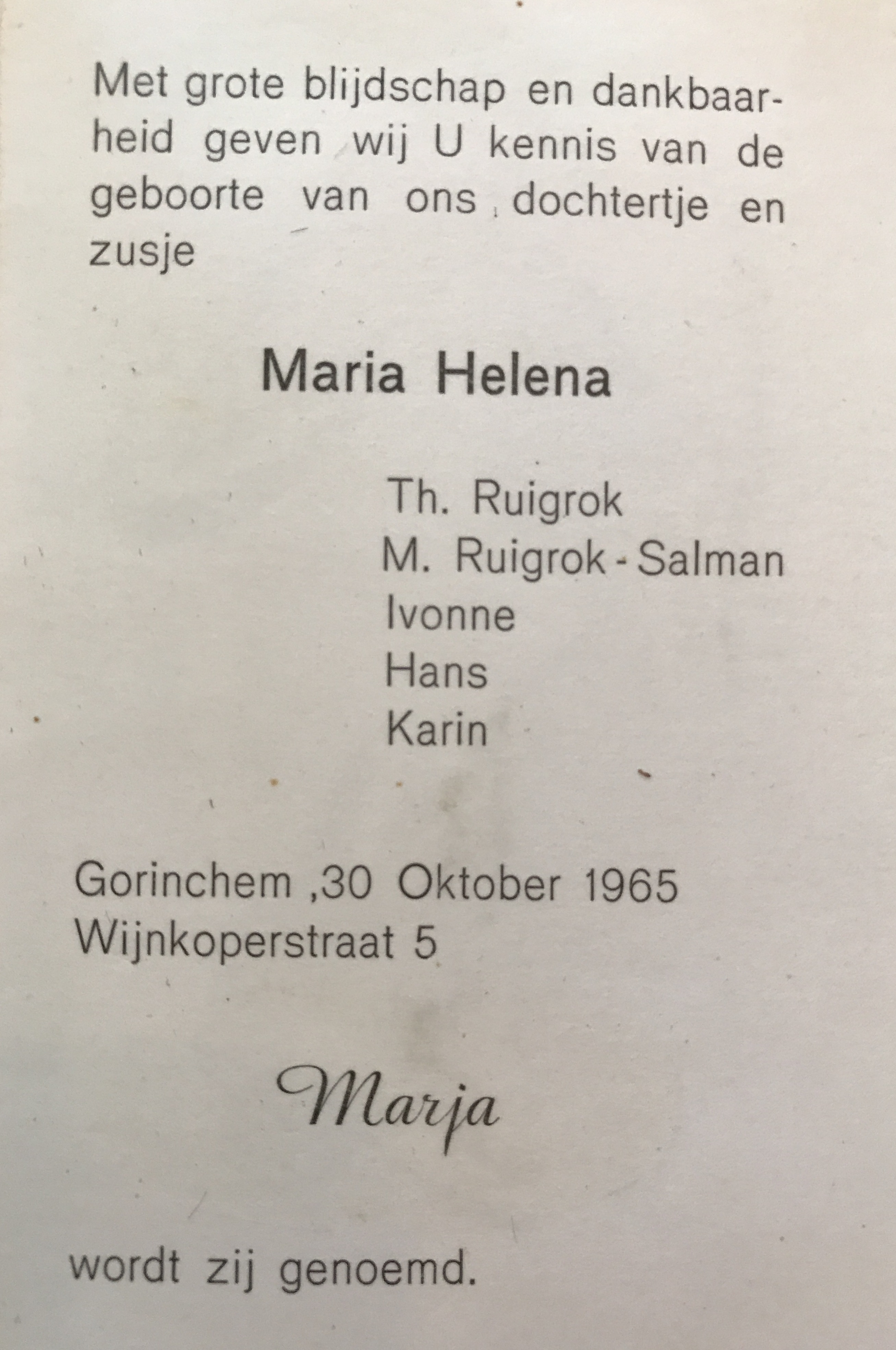 Het begin Marja Ruigrok • 30 oktober 1965 • 1.217 views Op 30 oktober 1965 ben ik geboren in Gorinchem uit ouders die beiden uit Noordwijk aan Zee kwamen. Allebei gingen ze als enigen uit een gezin van negen kinderen het dorp uit. Ik ben de jongste van vier kinderen: Yvonne, Hans en Karin. Als je niet kunt delen...Klik om te delen op Facebook (Wordt in een nieuw venster geopend)Klik om op LinkedIn te delen (Wordt in een nieuw venster geopend)Klik om te delen met Twitter (Wordt in een nieuw venster geopend)Klik om te delen op WhatsApp (Wordt in een nieuw venster geopend)