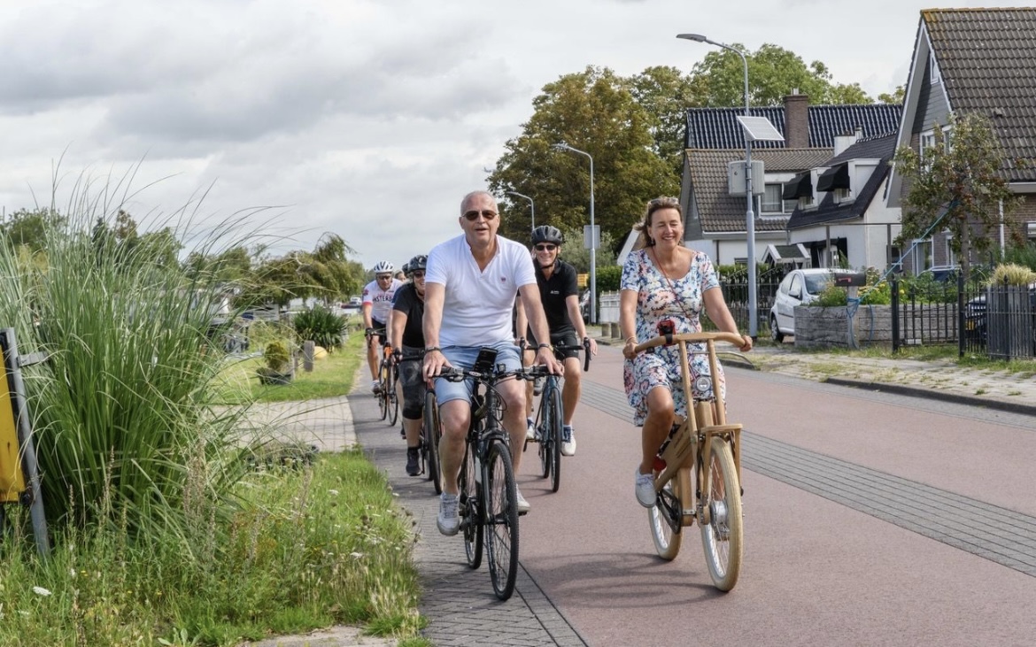 Stephan toont zich een ware ambassadeur en maakt meer mensen warm. En zo gebeurt het dat op zondag 13 augustus een vijftiental ondernemers in gezelschap van wethouder Marja Ruigrok in Rijsenhout op het zadel springen. Met de wind in de rug gaat het richting Oude Meer en Badhoevedorp. Onderweg is het netwerken en genieten van de fraaie omgeving. Bij het gemaal Lynden wijst de wethouder op een van de drie langs de Ringvaart geplaatste oplaadpalen voor elektrische fietsen.